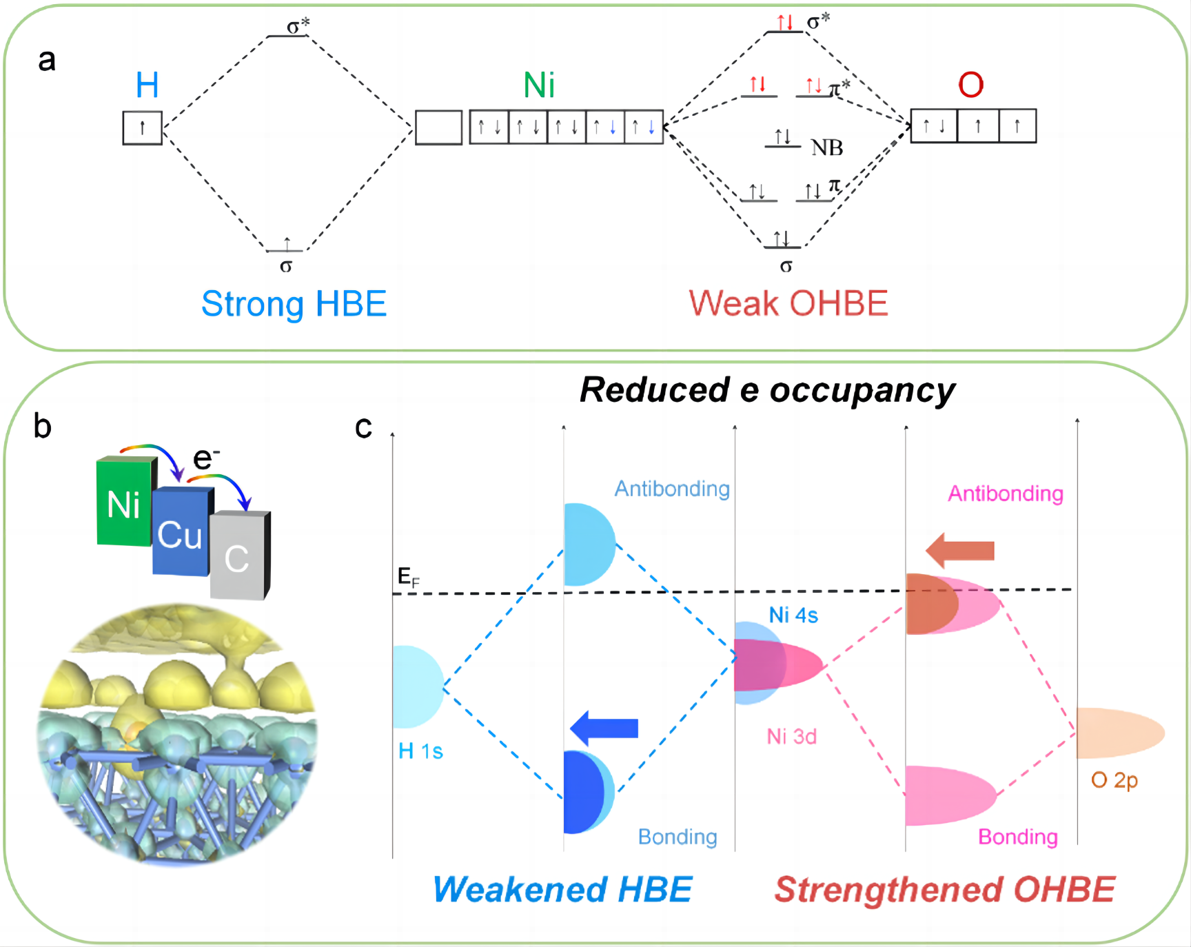 在该工作中,研究人员报道了一种通过原位纳米粒子-配体组装低温碳化策略可控合成氮掺杂碳壳包覆的NiCu纳米颗粒。所制得的Ni93Cu7@NC催化剂核心为Ni和金属间化合物Cu3.8Ni异质结构。该催化剂具有优异的HOR活性及稳定性,是目前最先进的Ni基HOR催化剂之一。在AEMFC中,电池可以提供高达381 mW cm-2的峰值功率密度。实验和理论研究表明,NiCu核和氮掺杂碳界面处电子的重新分布减少了s-s成键轨道和dz2/yz-p反键轨道的电子占据,从而优化了氢结合能(HBE)和氢氧结合能(OHBE),Ni93Cu7@NC催化剂催化HOR所需热力学能量最低。
