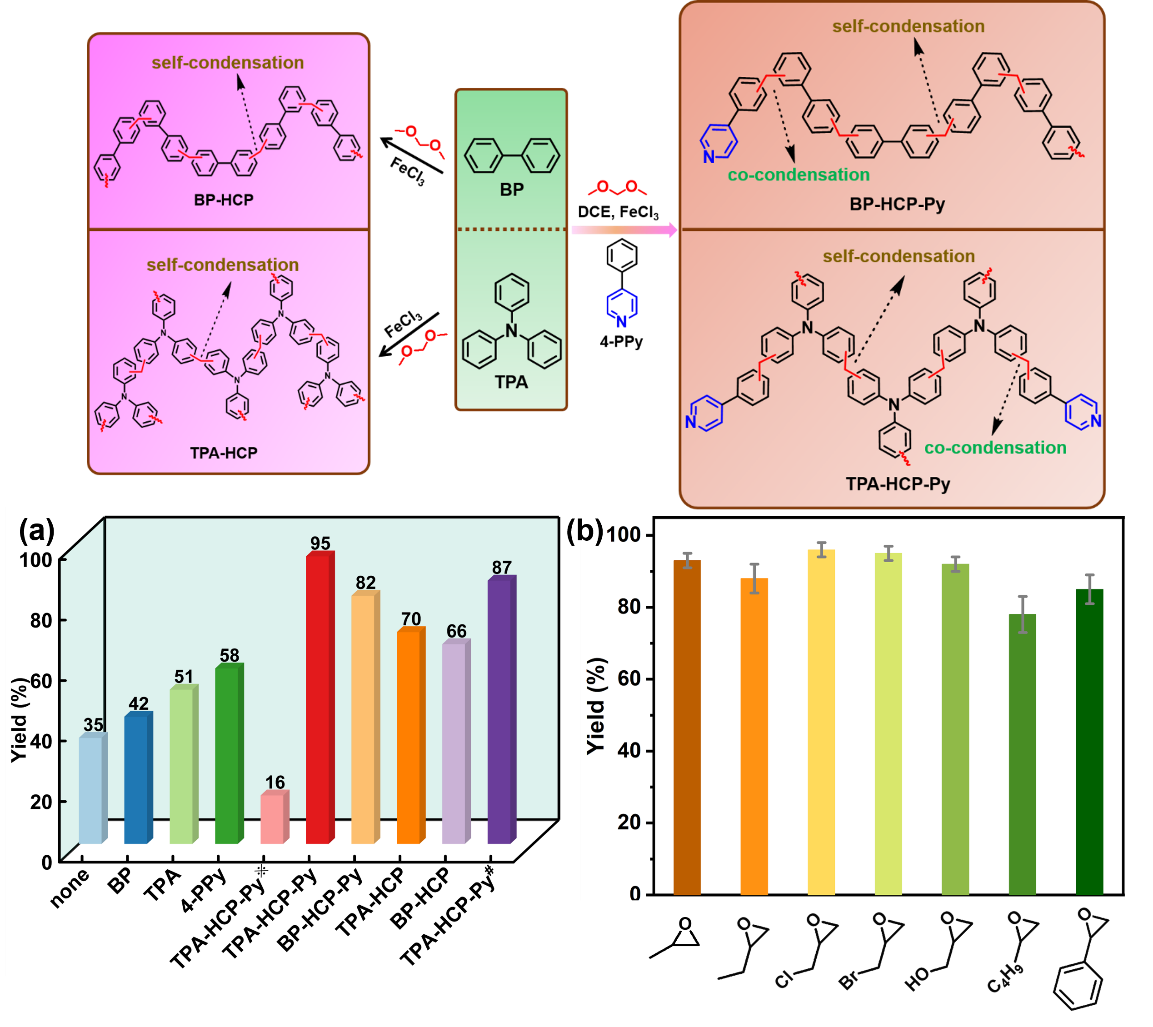 结合密度泛函理论(DFT)计算的方法,作者深入阐明了不同活性位点与模型反应物的相互作用以及新型催化微环境下CO2与环氧化物环加成反应机理,为功能导向新型催化材料的设计与开发提供了重要指导。该工作解决了当前多相催化剂存在的稳定性差、催化活性低导致的反应需要高温高压等问题。以上研究成果以“Experimental and theoretical investigation of phenylpyridine-based hypercrosslinked polymers for atmospheric CO2adsorption and fixation under solvent-/metal-free conditions”为题发表于国际化工三大刊的Chemical Engineering Science,论文链接:https://doi.org/10.1016/j.ces.2024.120298。77779193永利官网化工学院2022级硕士研究生曲添添为第一作者,刘猛帅与刘福胜为论文共同通讯作者,77779193永利官网为第一通讯单位。