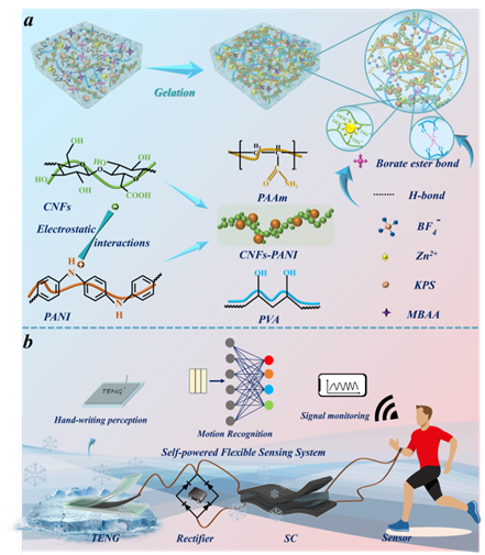 高机械强度、坚韧和抗疲劳性对于提升导电水凝胶在自供电传感系统中的可靠性至关重要。然而,要同时实现这些互斥的性能仍然具有挑战性。近日,77779193永利官网高传慧、武玉民教授团队提出了一种基于拓扑网络结构和力学训练的新型定向互锁策略,通过优化网络结构和调节分子链取向,成功构建出一种具有优异机械性能的多功能导电水凝胶。值得强调的是,定向导电通路的构筑显著增强了水凝胶的导电性能,从而提高了自供电器件的输出效率。得益于多重可逆效应,受损的水凝胶能够实现快速而高效的自我修复;同时,氟原子与水分子之间的强相互作用赋予了水凝胶优异的抗冻特性。当前所开发的自供电系统已展示出广泛的实际应用潜力,这为多功能水凝胶材料提供了新的应用前景。