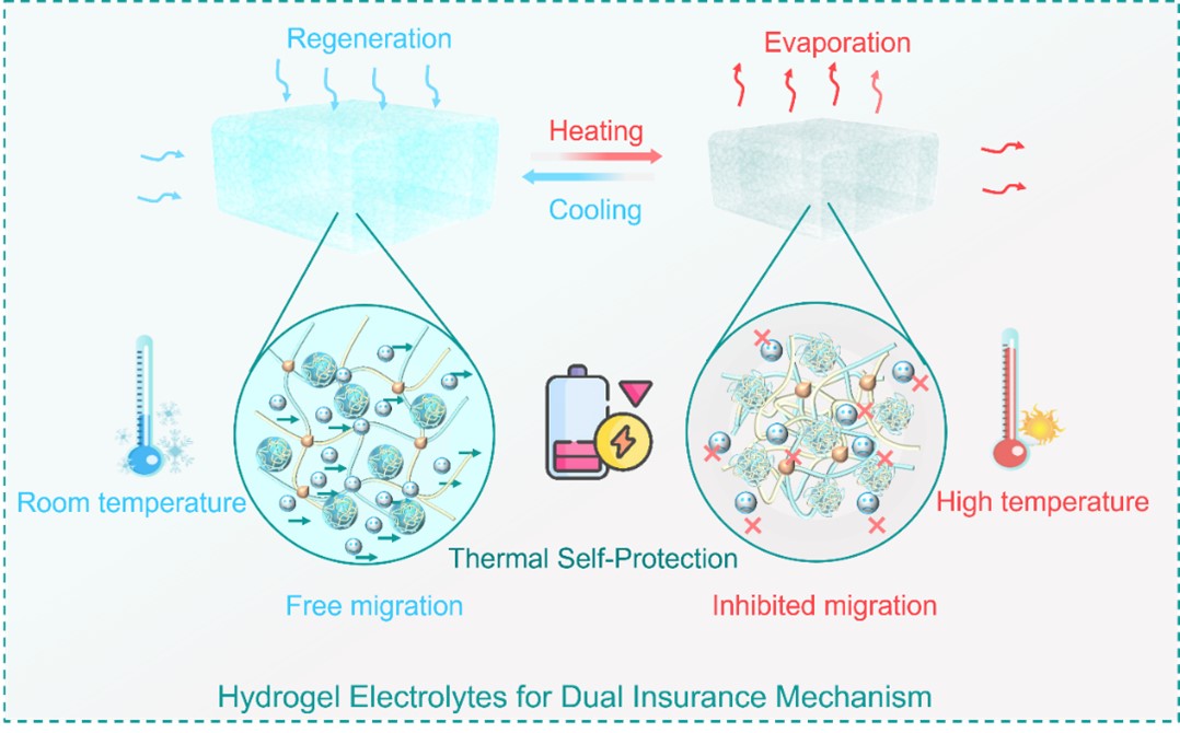 本研究通过调控亲水性与疏水性单体的比例,成功实现了对水凝胶电解质相转变温度的精准调节。该智能电解质通过构建“双重保险”热防护机制实现主动热管理。第一重防护由嵌入水凝胶基体的纳米微球与水凝胶网络协同作用,在温度升高时快速触发由亲水向疏水状态的转变,从而迅速关闭离子传输通道,有效响应热量积聚。作为补充,材料中水分的蒸发进一步阻碍离子迁移,构成第二重热保险。得益于水凝胶网络的热可逆特性,基质在冷却后能够恢复原有容量;同时,电解质具备良好的再生能力,可动态调节基体含水量,确保离子传输性能的稳定恢复。