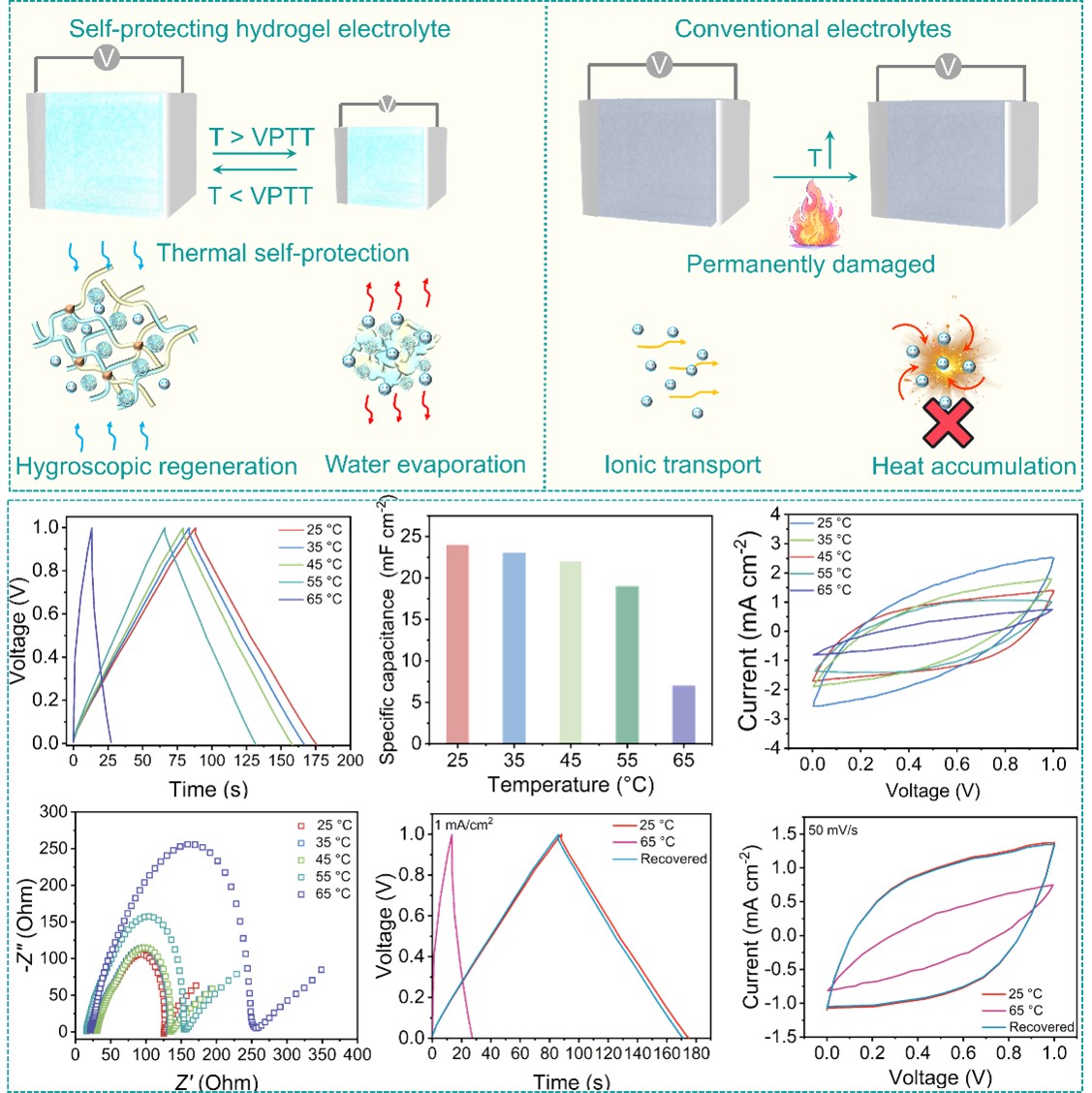 随着新能源技术的迅猛发展,储能设备的高效性与安全性成为核心挑战。其中,热失控问题尤为严峻——在快速充放电、高温或短路等极端工况下,储能系统内部温度骤升,易引发电解液分解、隔膜熔融,甚至导致设备燃烧或爆炸,严重威胁使用安全。传统热管理策略主要依赖于冷却液、风扇等物理散热手段,存在体积大、效率低、难以逆转等局限。而现有的热响应型电解质虽具备热触发保护功能,但普遍存在响应慢、不可逆及保护效果单一等问题,难以满足柔性储能器件对长期稳定性的需求。