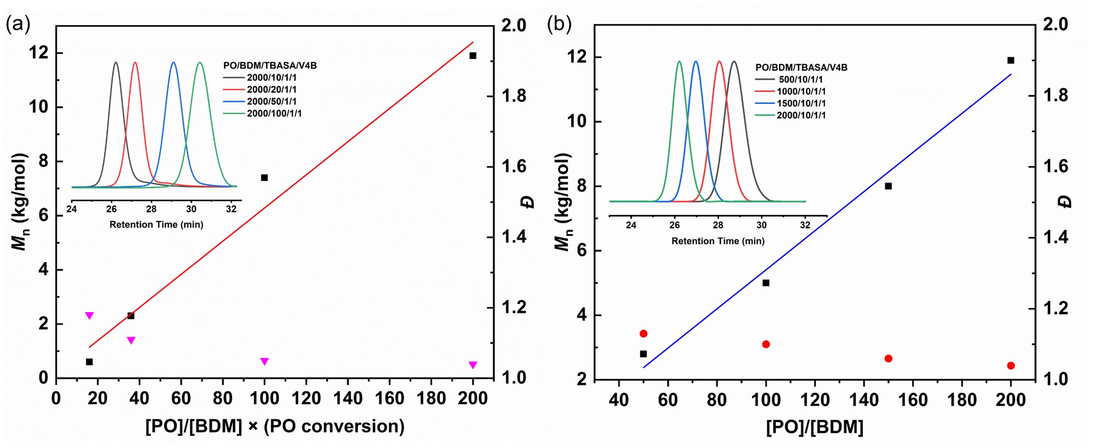 图7.(a)在不同PO/CTA比例下,PPO分子量的变化,插图,不同当量链转移剂条件下,PPO的GPC曲线变化。(b)链增长实验,插图,不同单体/链转移剂条件下,PPO的GPC曲线变化。