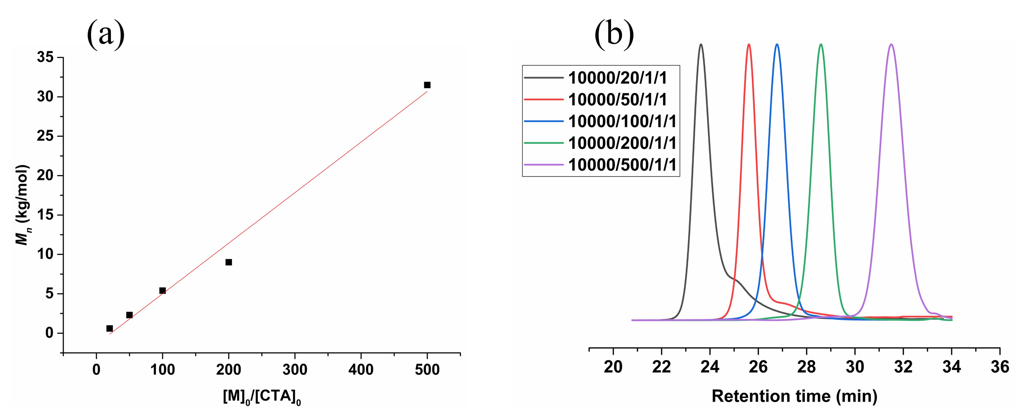 图2(a)PO完全转化时,不同PO/CTA比例下的分子量;(b)乙二醇调控的PPO分子量的GPC曲线