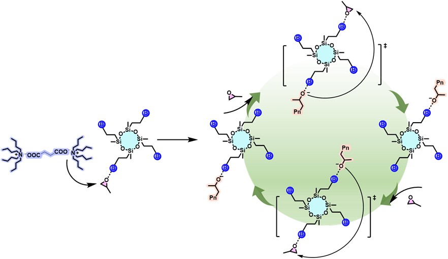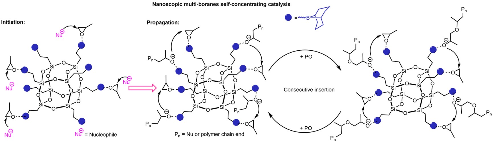 基于实验和DFT计算,他们提出了POSS-B8催化PO高效开环聚合的可能机理,Si-O-Si倍半硅氧烷表面的硼烷活性位点具有较高的局部浓度,在空间上形成了一种局部环境,其中硼烷稳定的醇盐活性链端和硼烷活化的PO之间可以快速交换(一个硼烷可以与三个硼烷中心配对,同时以协同方式的方式催化PO开环聚合),这使得聚合过程以“分子内”链增长方式进行,从而显著提升了POSS-B8的催化性能(图5)。