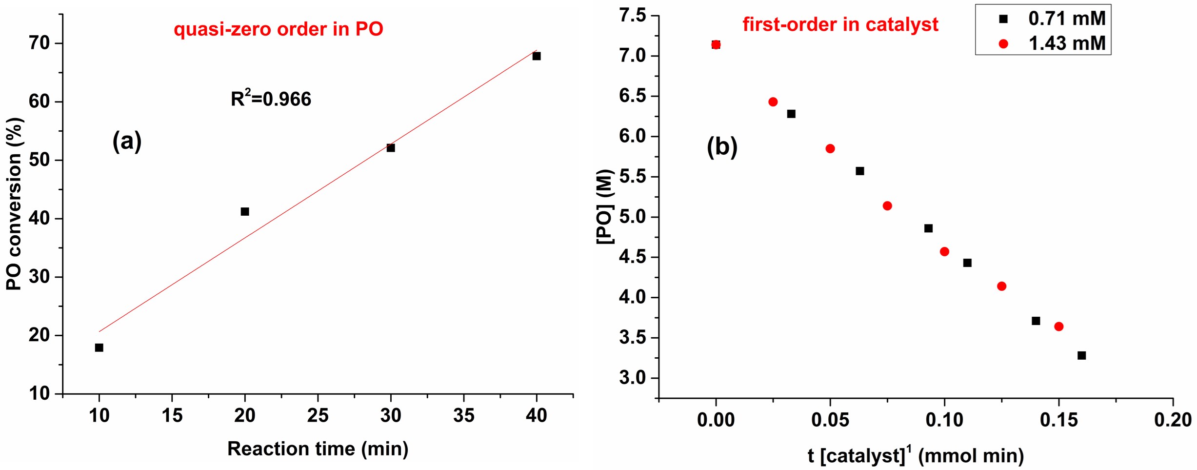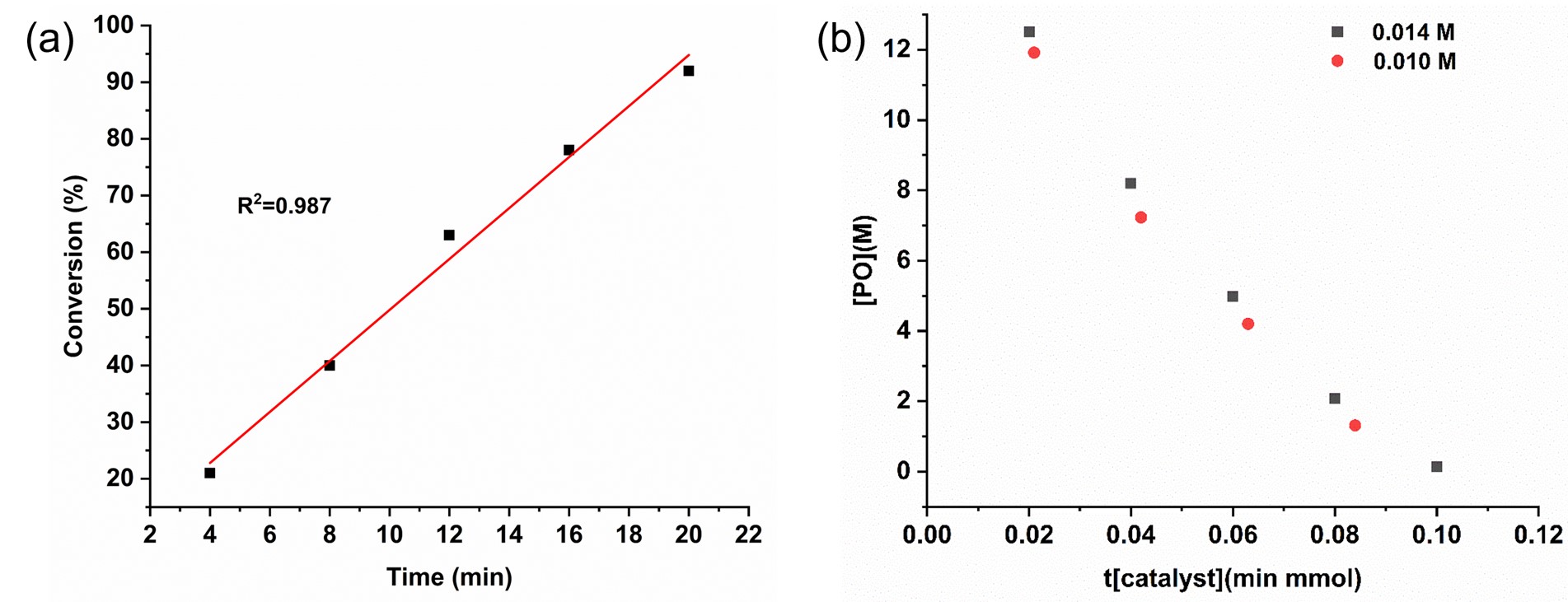 图8.(a) PO转化率与反应时间的关系图(PO假零级),聚合在0.7 mL THF溶液,25°C条件下进行,摩尔比为[PO]0/[V4B]0/[TBASA]0=1000/1/1;(b)在25°C的THF溶液中使用两种不同浓度的V4B(14 mM,10 mM),PO浓度与归一化时间尺度t[catalyst]n的关系图。固定V4B/TBASA的投料比为1/1,当n=1时,两条曲线重叠,表明二元催化剂V4B/TBASA为一级动力学。
